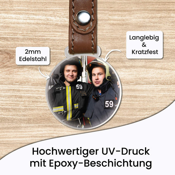 Ein Band aus Feuer und Brüderlichkeit Dieser besondere Schlüsselanhänger wurde für all jene geschaffen, die Seite an Seite durchs Feuer gehen. Auf der Vorderseite verewigst Du ein starkes Foto – ob im Einsatz, in Uniform oder mit der Crew. Die Rückseite trägt die Gravur, die verbindet: „Bruder in Flammen“ – ein Ausdruck tiefen Zusammenhalts, Mut und gegenseitigem Vertrauen unter Feuerwehrkameraden.