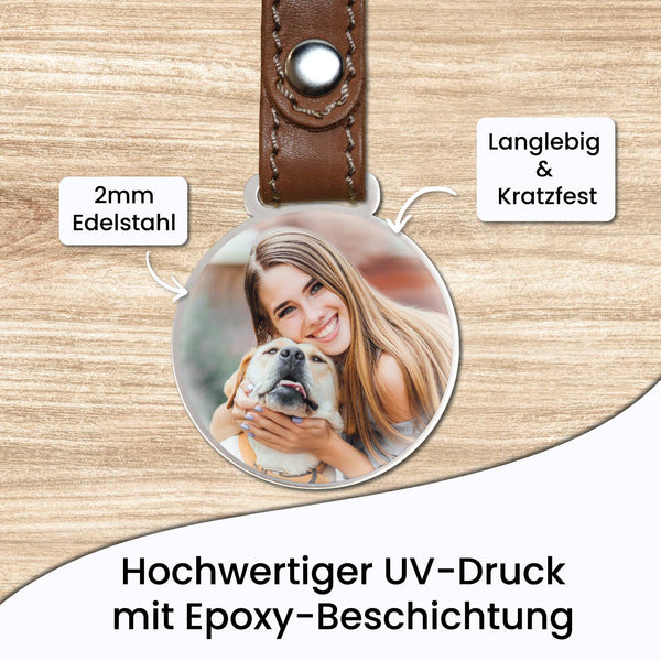 Stark, schön und langlebig – genau wie Eure Verbindung Aus 2 mm starkem, poliertem Edelstahl gefertigt, hält dieser Anhänger dem Alltag genauso stand wie der wildeste Spaziergang. Die hochwertige Gravur auf der Rückseite bleibt dauerhaft lesbar, während das beschichtete Foto auf der Vorderseite gegen Kratzer, Feuchtigkeit und UV-Strahlung geschützt ist. Ob am Schlüsselbund, am Rucksack oder als dekoratives Accessoire – dieser Anhänger ist so vielseitig wie Dein Leben mit Tier.
